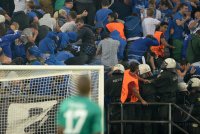 - FUSSBALL CHAMPIONS LEAGUE SAISON 2013/2014 PLAY-OFF FC Schalke 04 - Paok Saloniki 21.08.2013 Polizisten stuermen waehrend des Spiels den Schalke Fan Block. FOTO: Pressefoto ULMER/Bjoern Hake xxNOxMODELxRELEASExx