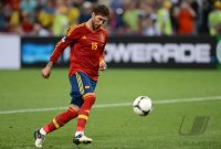 - FUSSBALL EUROPAMEISTERSCHAFT 2012 HALBFINALE Portugal - Spanien 27.06.2012 Sergio Ramos (Mitte, Spanien) springt beim Elfmeterjubel am hoechsten FOTO: Pressefoto ULMER/Markus Ulmer xxNOxMODELxRELEASExx