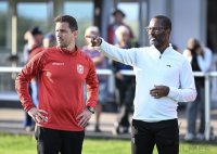 - Fussball 14.06.2025 Jubilaeumsspiel: Suisse Legends gegen FC Post Solothurn ( 80 Jahre) Martina Moser (li) und Stephane Chapuisat (re) FOTO: Pressefoto ULMER / Markus Ulmer xxNOxMODELxRELEASExx