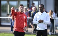 - Fussball 14.06.2025 Jubilaeumsspiel: Suisse Legends gegen FC Post Solothurn ( 80 Jahre), Kurdische FC Solothurn (50 Jahre) alt. JUBEL Stephane Chapuisat (Mitte) klatscht Fabienne Humm (re) ab, Adrian Winter (li) FOTO: Pressefoto ULMER / Markus Ulmer xxNOxMODELxRELEASExx